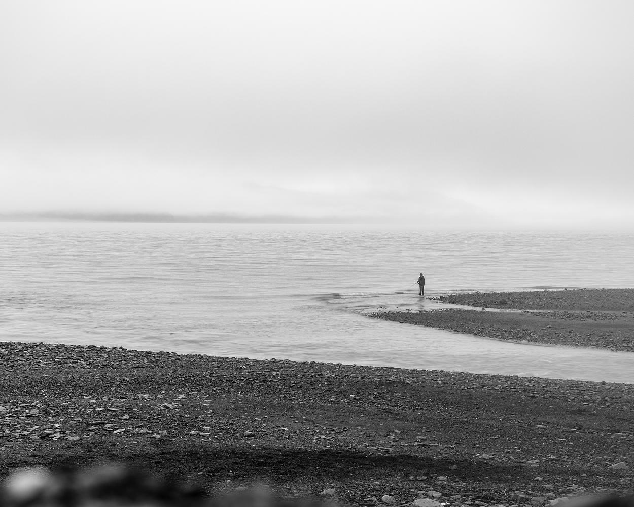 A man fishing at midnight on Seward, Alaska's coast. In black and white. For those who know the importance of patience and wait for the greatest catch.